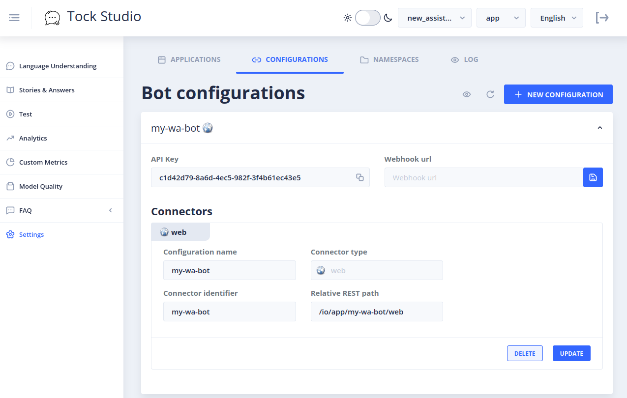 Take notice of the "Relative REST path" of the connector. This is the path that we will use to send messages to Tock.