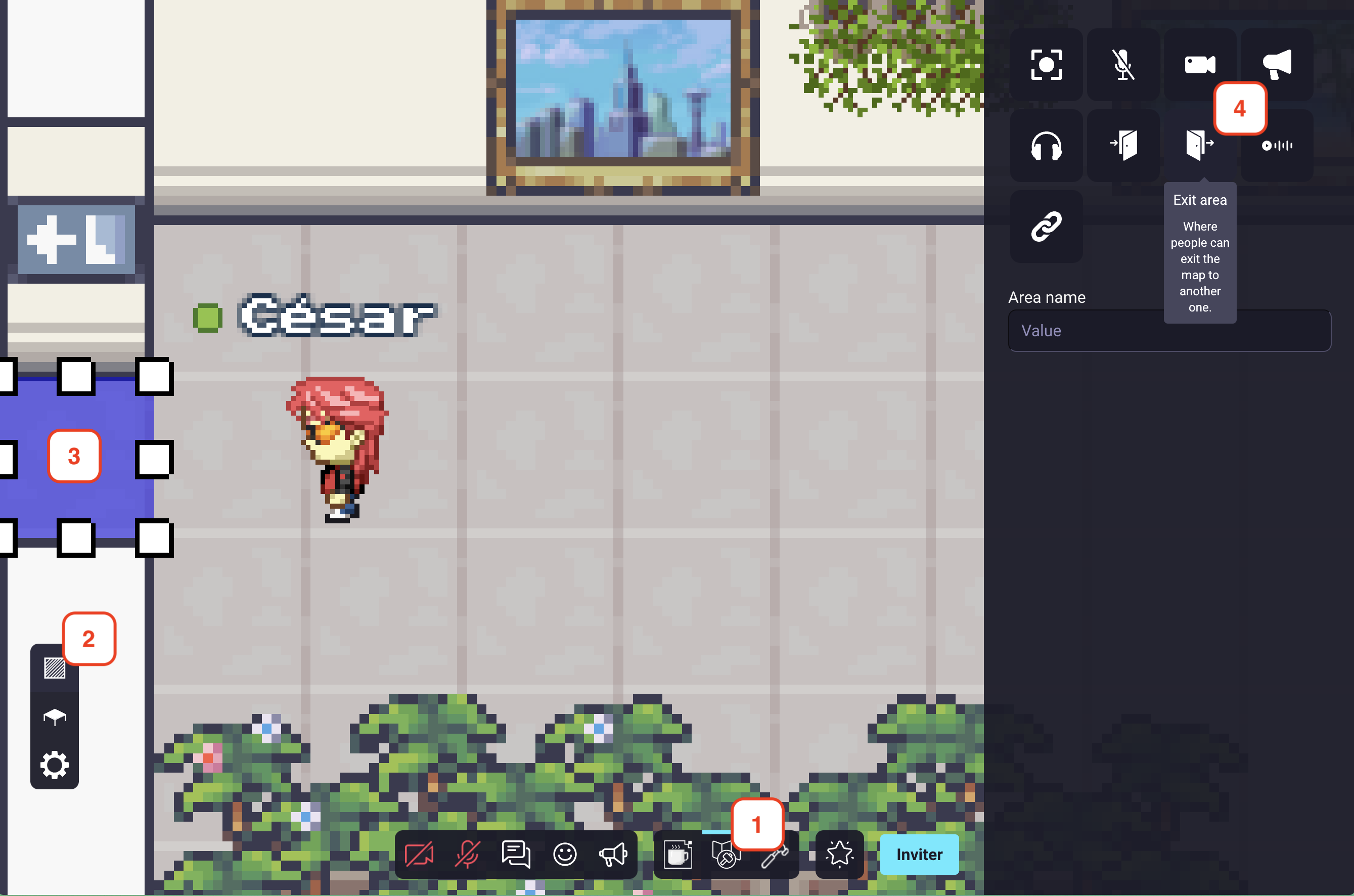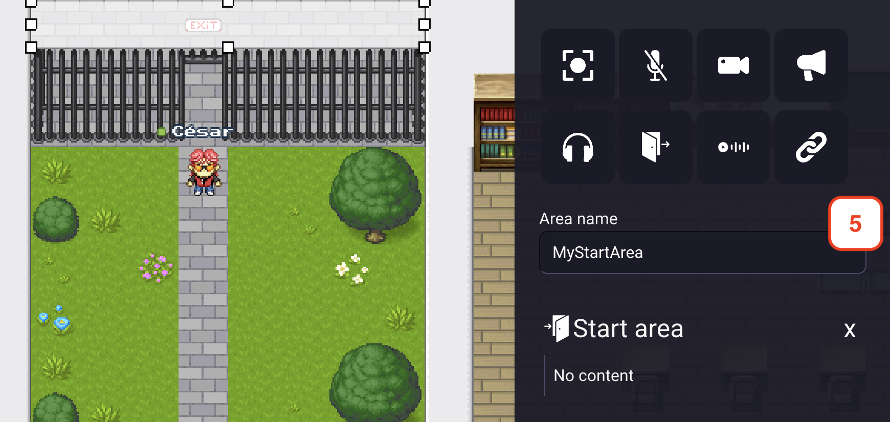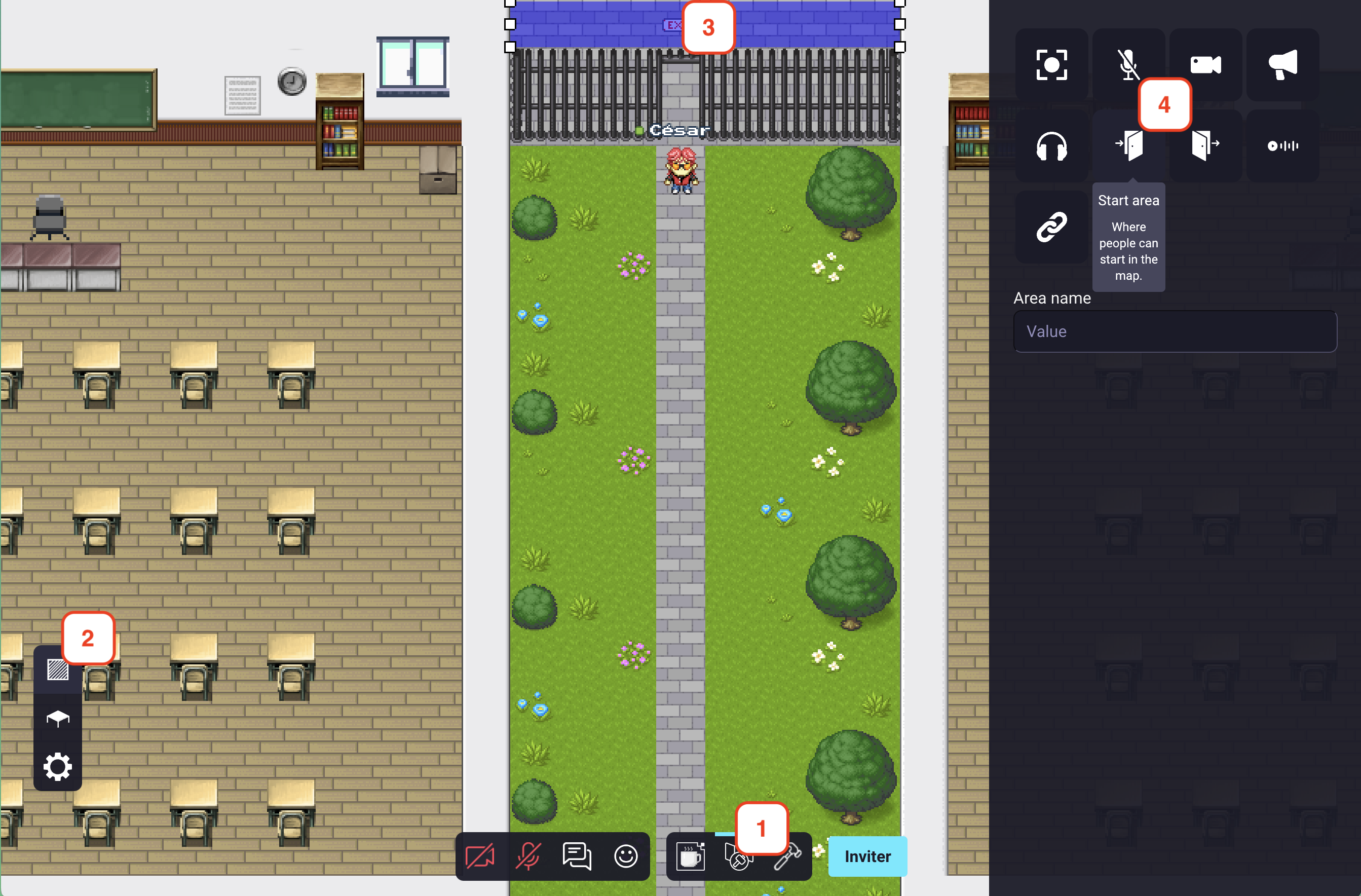 If you expect many people to connect to your map at the same time (for instance, if you are organizing a big event), consider making a large start area. This way, users will not all appear at the same position and will not pop randomly in a chat with someone connecting at the same moment.