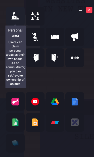 A personal area is a designated zone where a user can claim ownership or be assigned as the owner. This feature allows the user to add objects to their area and display their visit card when they are away. Essentially, it serves as the user's virtual office space.