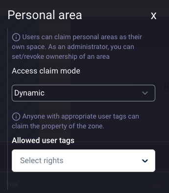 If the personal area is set to dynamic access mode, users with the allowed tags can claim the area by walking through it. A pop-up invites them to claim or decline the area.