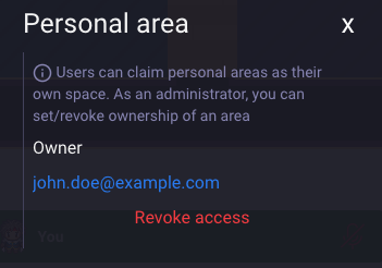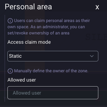As an authorized user, you can manage personal area properties in the map editor. If an area is claimed, you can revoke access, making the area available for others to claim.