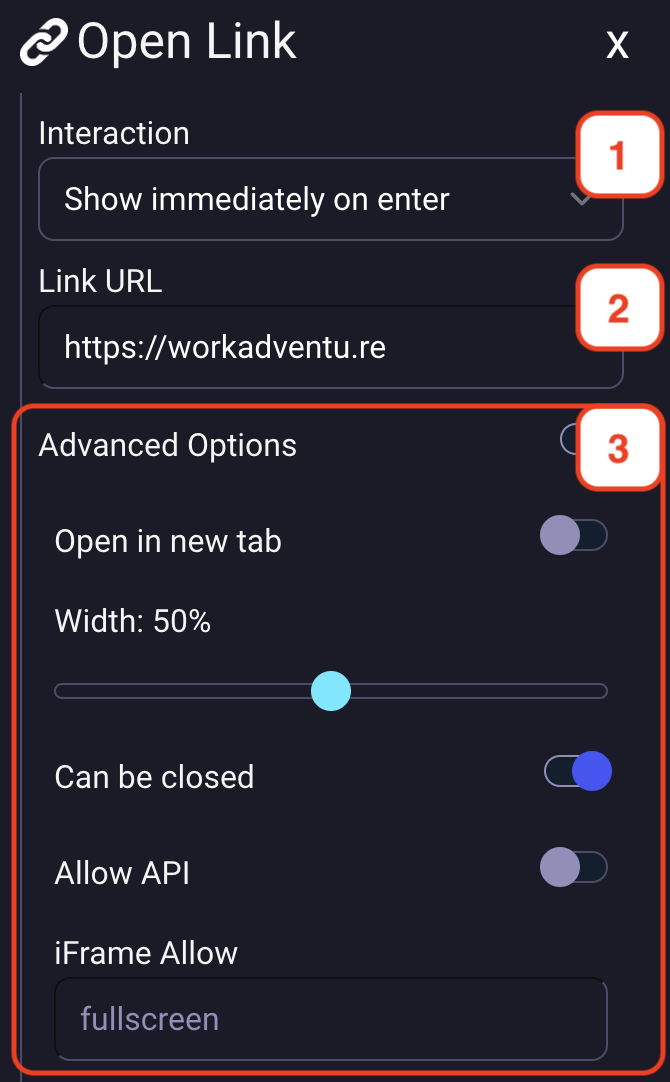 3. Those settings are related to the way the action is triggered. You can choose to open the link in a new tab, or in a co‑website (an embedded website panel inside WorkAdventure). You can configure its size, whether it can be closed, etc.