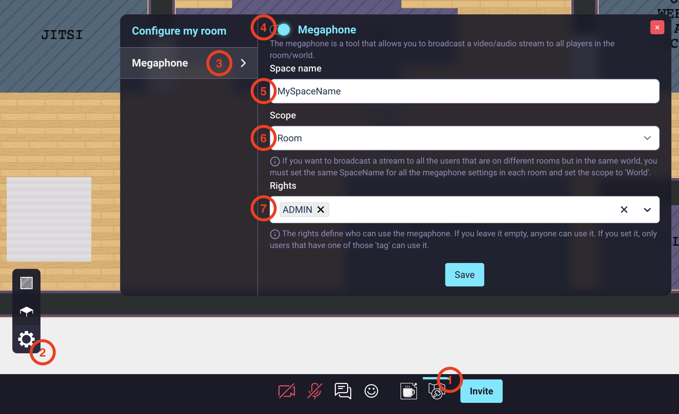 - Define the scope of your megaphone. The scope can be set as "room" or "world". If you choose "room", the megaphone's range will be limited to the current room. If you select "world", the megaphone's reach will extend across multiple rooms. Individuals in any room configured with the same "space name" will be able to hear you when the megaphone is enabled.
